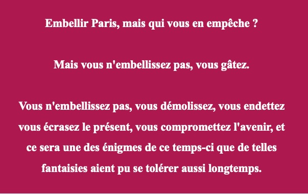 A l’heure où les controverses sur l’esthétique parisienne font rage, double devinette pour nos lecteurs joueurs : de quand date le texte dont quelques extraits…