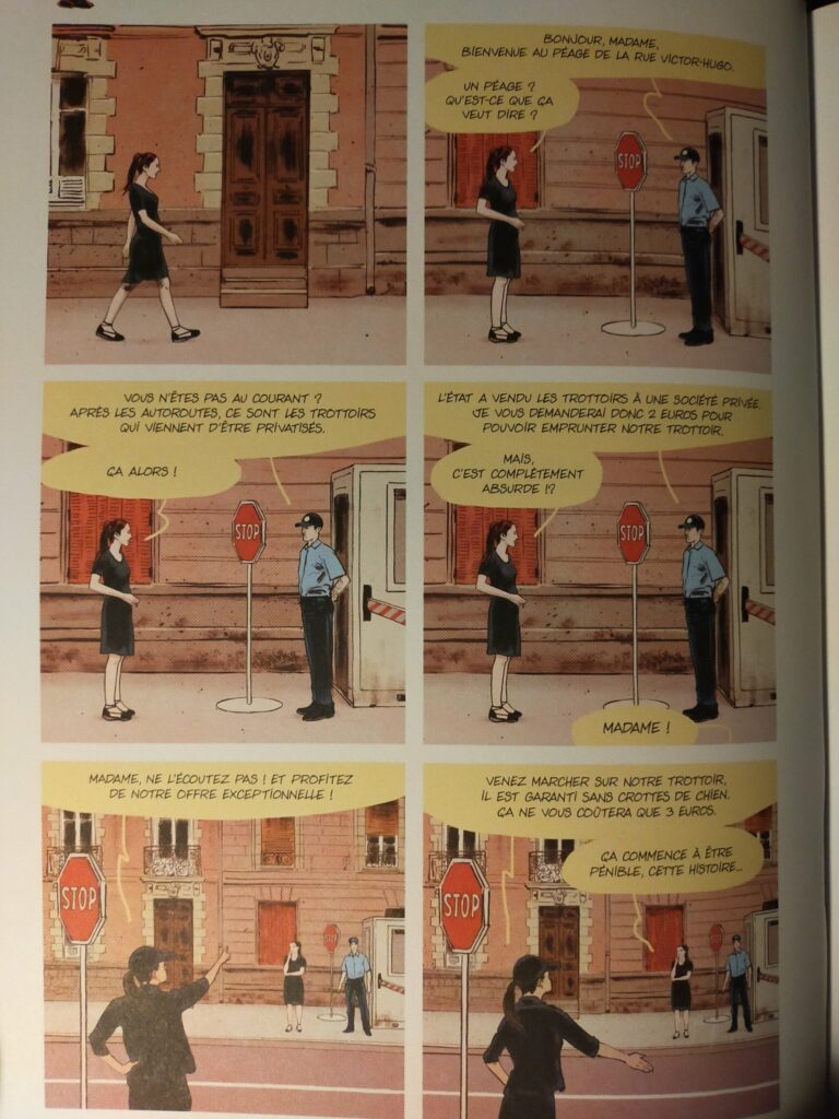 Merci à Benjamin Pradel de nous avoir signalé cette planche de BD sur la « privatisation des trottoirs » (« Il faut pas prendre les gens pour des…