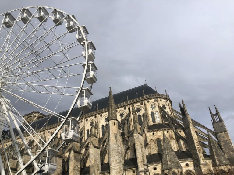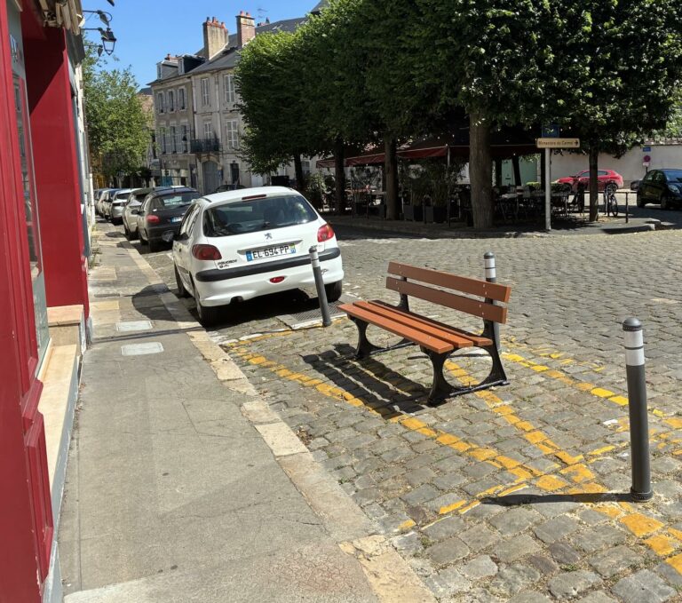 Au départ, c’est un banc intrigant. Sur une place de stationnement, face au trottoir. Il permet d’observer une vitrine… ..avec une Vue Sud-Ouest de Bourges…