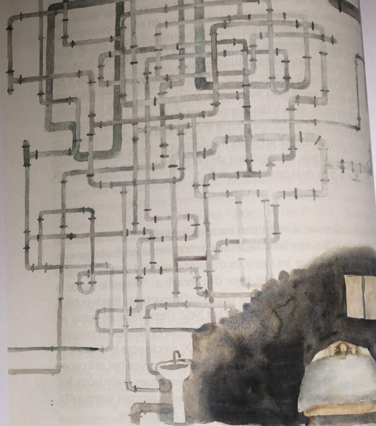 « Ecouter la rivière la nuit » est le titre de cette aquarelle de Suzanne Husky, page 52 du dernier livre qu’elle a co-signé avec Baptiste Morizot…