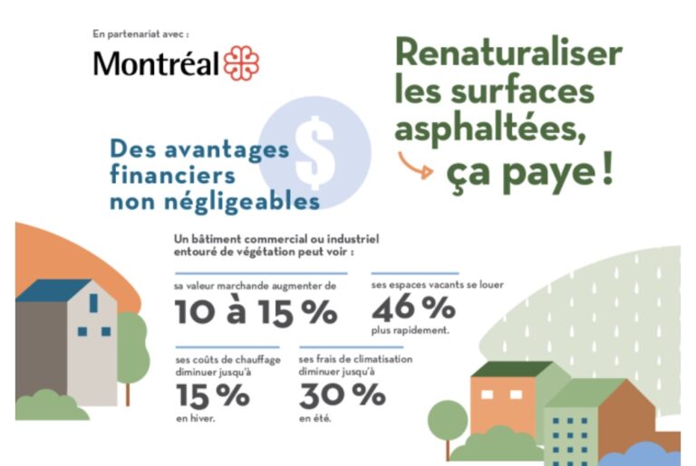 « Renaturaliser les surfaces asphaltées, ça paye ! », indique le Centre d’écologie urbaine du Québec, qui liste « des avantages financiers non négligeables », avec notamment le fait…